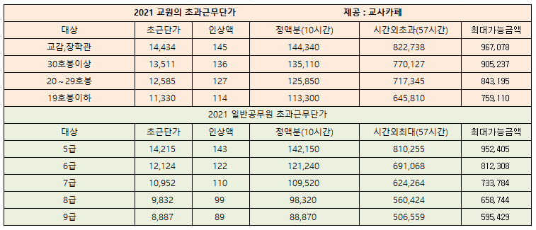 2021년 교사 시간외 근무 수당, 2021 교원 초과근무 단가