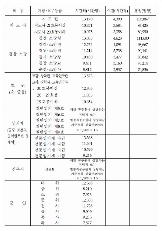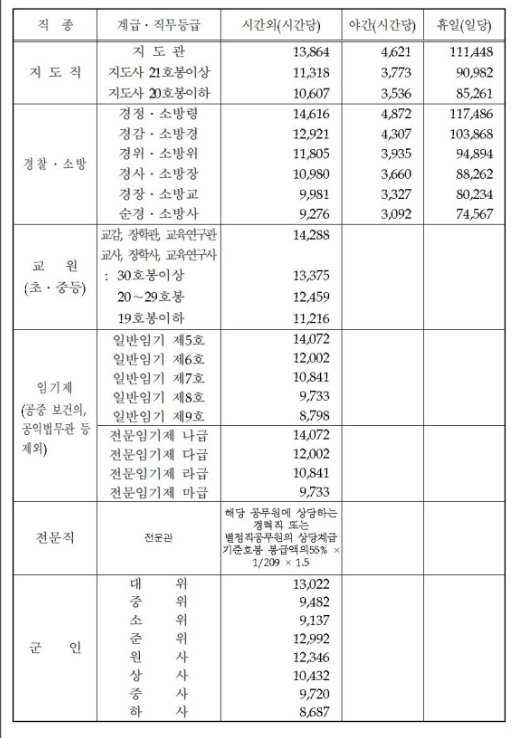 지도직 경찰, 소방, 공중보건의, 전문직 교원 교사 군인 2020 공무원 시간외수당 단가표  2020년 공무원 시간이 근무수당 단가표