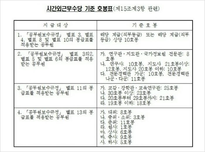 자세한 내용은 글 끝의 공무원 초과근무수당 지급기준 (처리지침)을 참조해주세요.