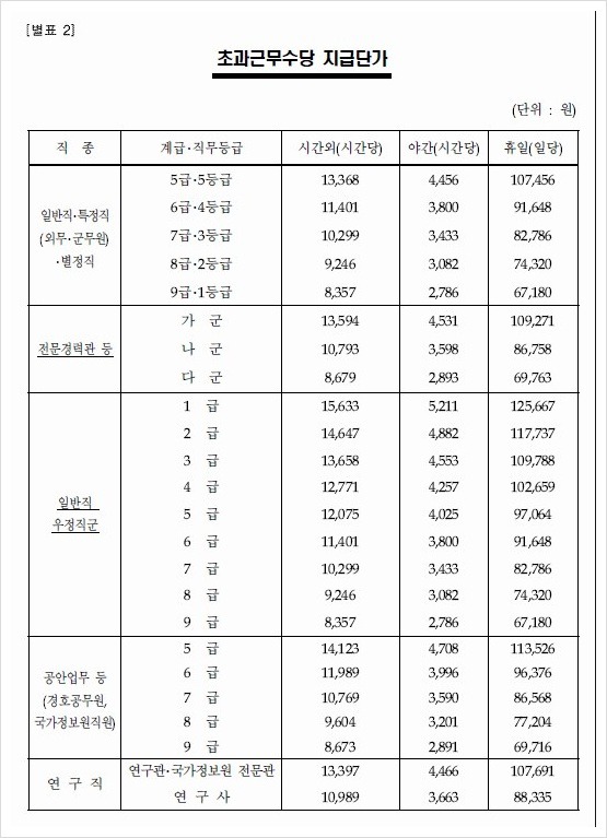 일반직, 우정직, 공안직 연구직 2020년 공무원 초과근무수당 단가표