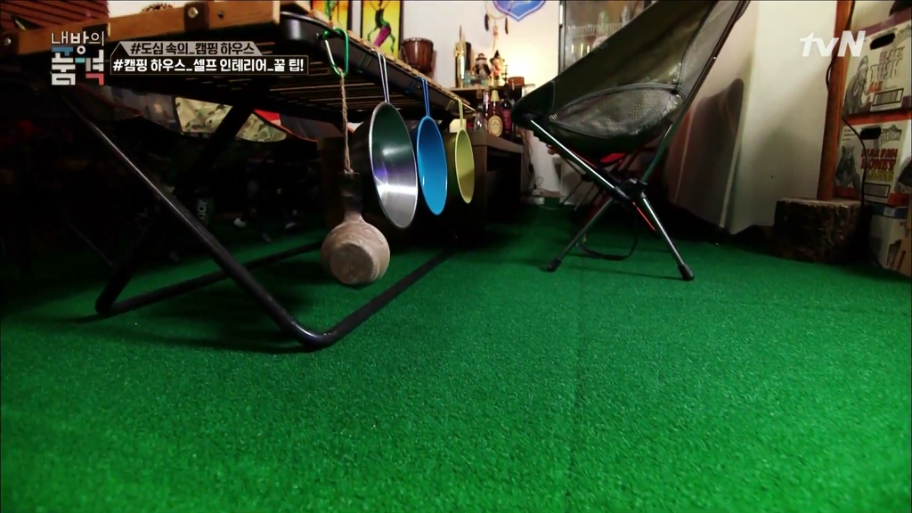 캠핑 감성을 내기 위해서 바닥을 인조잔디로 덮어서 캠핑장 분위기를 냈다.