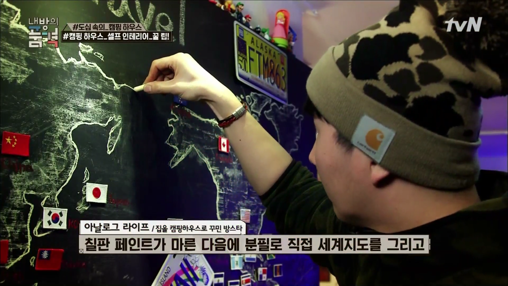 인테리어 소품으로 칠판에 세계지도를 그리고 방스타가 세계여행을 다녀온 곳의 국기 패치를 붙였다.