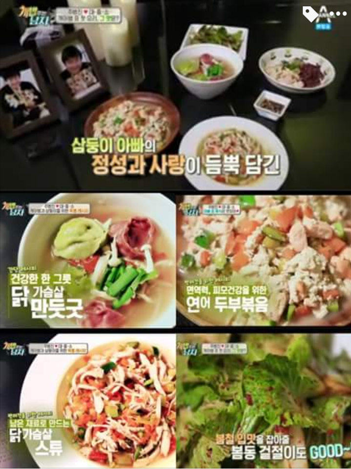 싱글남과 삼둥이를 위해 닭가슴살 만둣국 연어두부볶음 닭가슴살스튜 봄동 겉절이.