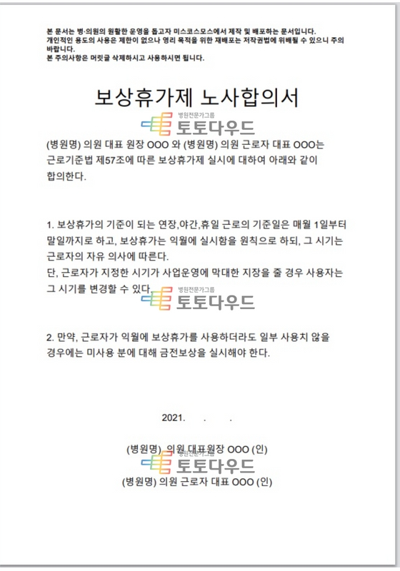 - 근로자 또는 근로자 대표가 서면으로 고용주와 특정한 근로일과 공휴일을 교환하는 합의를 했다면, 대체휴일 제도와 보상휴가제를 사용할 수 있습니다.