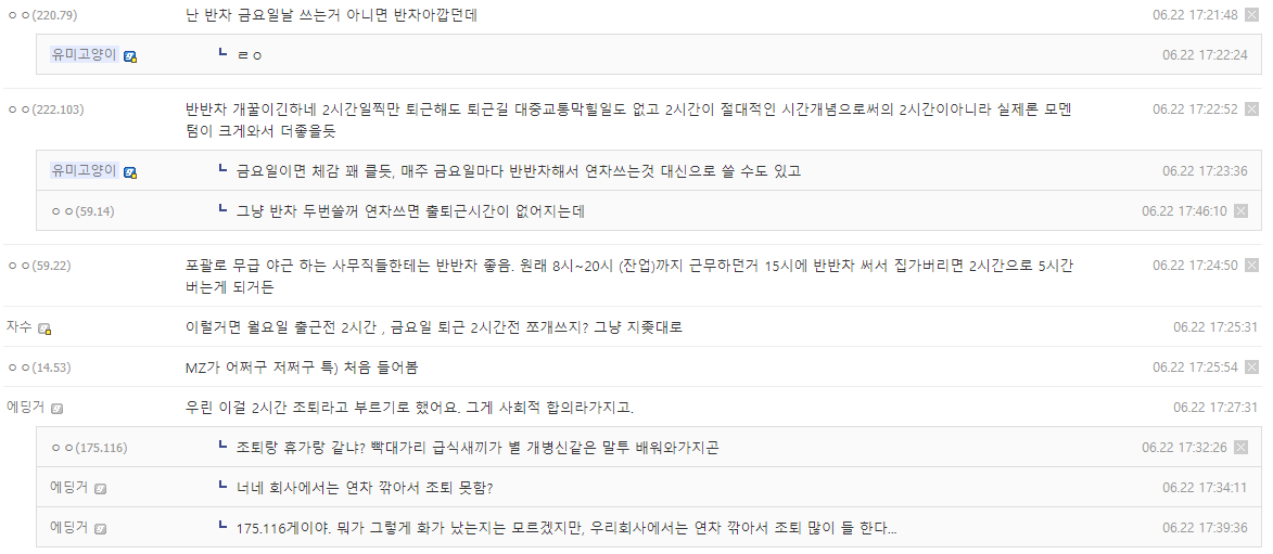 키워드: 근로기준법, 연차, 월차, 반차, 반반차, 반반반차, 30분 휴가제도, 2시간 조퇴, 사회적 합의, 효용성, 유연한 사용 방법, 워크라이프밸런스, 출퇴근 시간, 모멘텀, 체감 시간, 금요일 효과