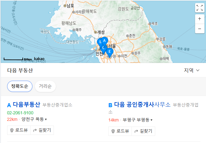 다음 부동산의 메인 지도에서 관심 지역(예: 서울 강남구, 부산 해운대구)을 확대하면 매물 위치가 핀(마커) 형태로 표시됩니다.