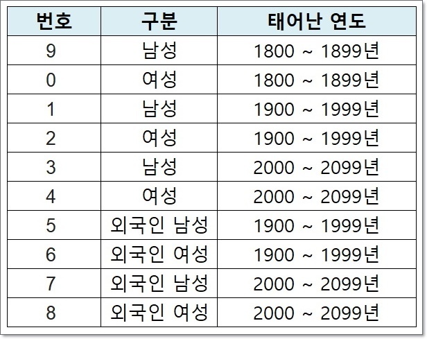 1. 성별 (1자리): 성별을 나타내는 번호입니다. 1900년대 출생 남성은 '1', 여성은 '2', 2000년대 출생 남성은 '3', 여성은 '4'로 표시됩니다.