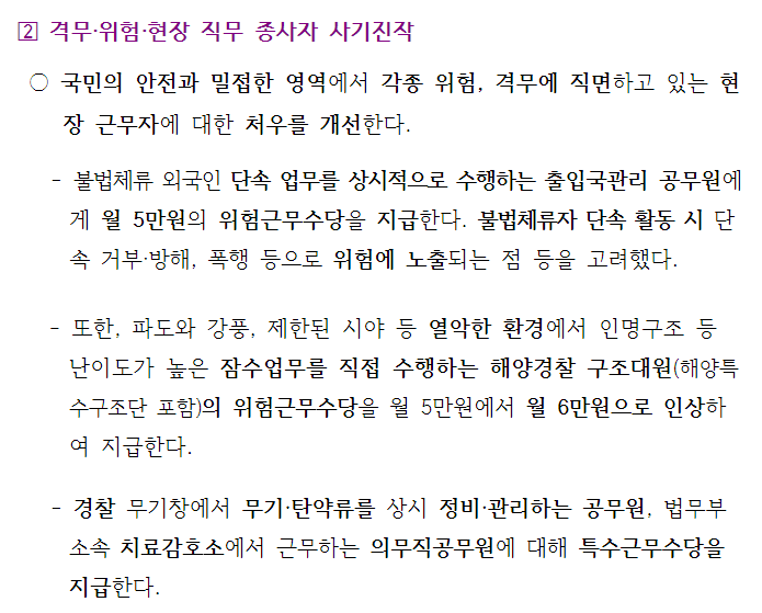 또한 직무 중요도와 난도가 높은 업무를 수행하는 6급 이하 공무원들에게는 중요직무급을 신설해 월 10만 원을 지급합니다.