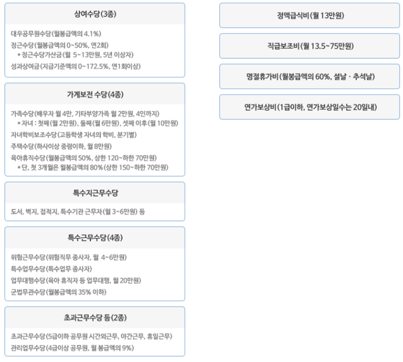 - 실비변상, 정액급식비, 직급별 보조비 등의 다양한 수당이 있으며, 이들은 공무원들의 생활 안정과 복지를 위해 지급됩니다.