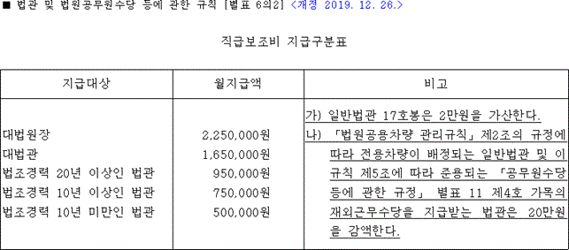 판사의 직급보조비 역시 법조경력에 따라 지급되며, 대법관 직급보조비는 검찰총장 직급보조비와 같은 월 165만원이 지급되며 대법원장은 사법부의 수장으로 행정부 수장인 대통령과 동급이지만 대통령 직급보조비는 320만원인데 반해 대법원장과 국회의장은 225만원의 직급보조비를 받습니다.