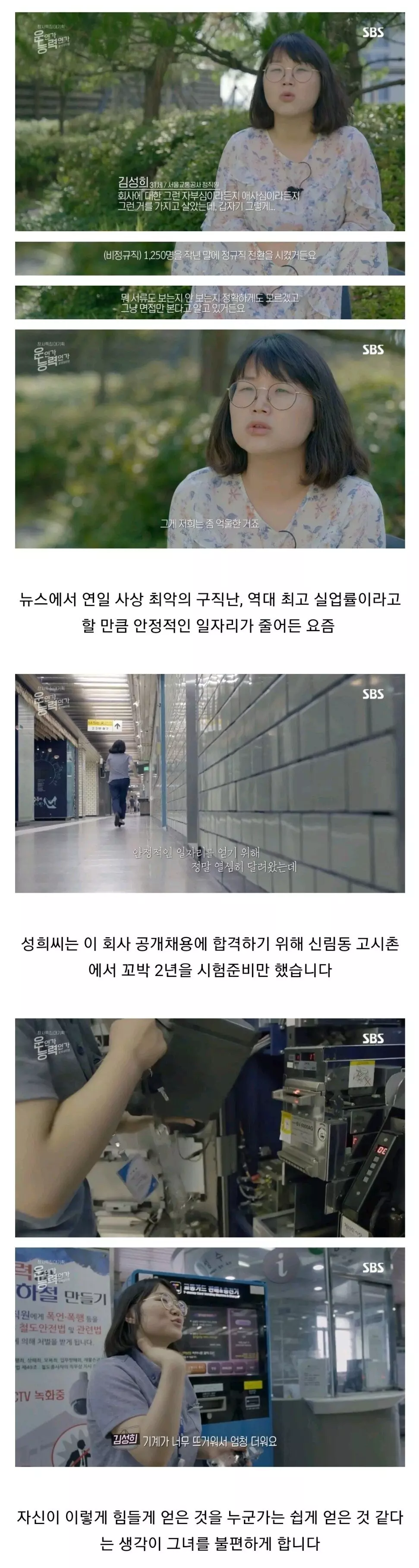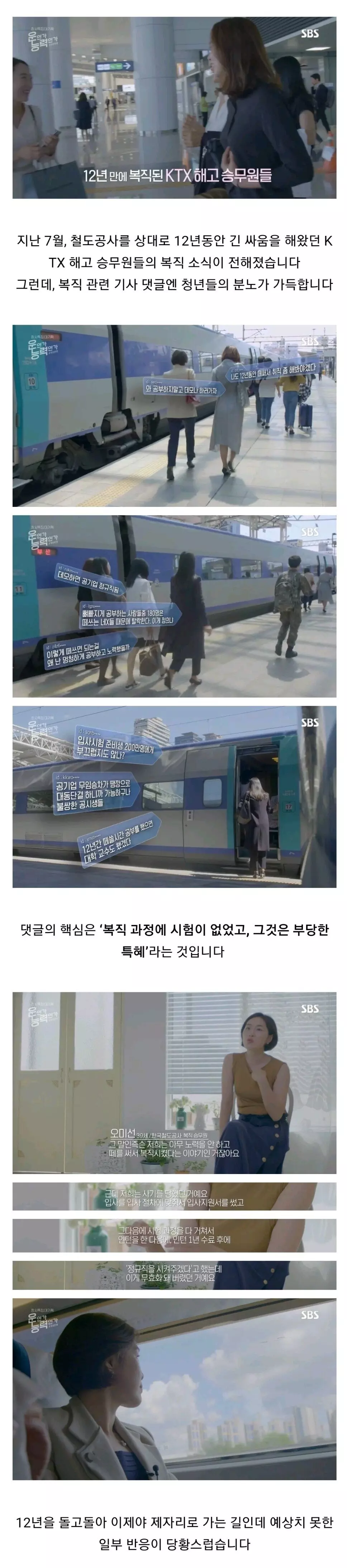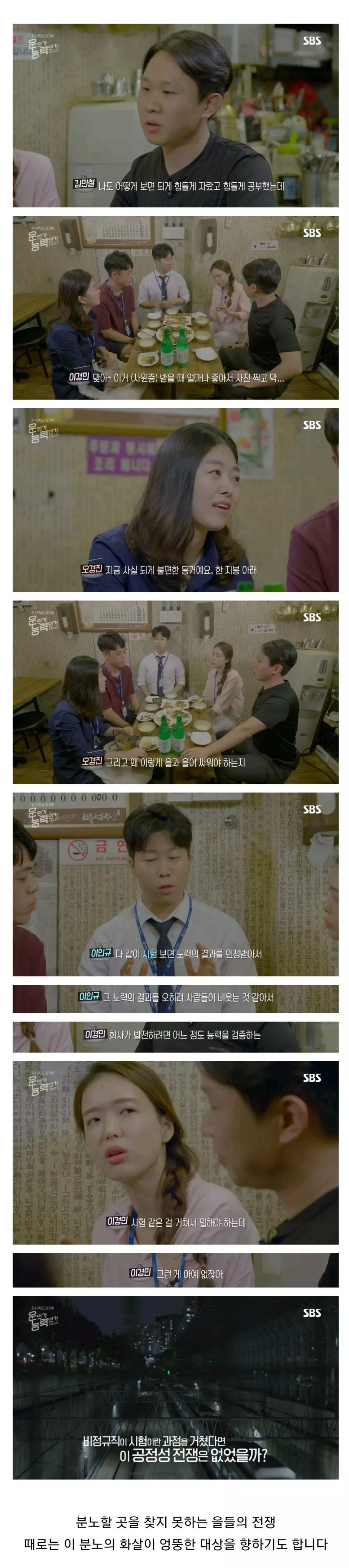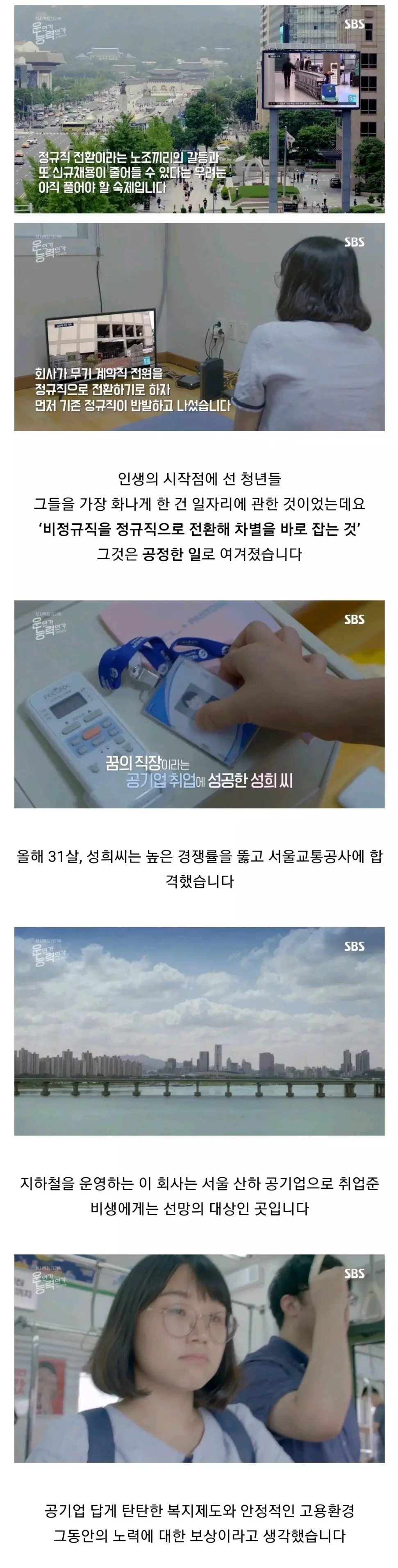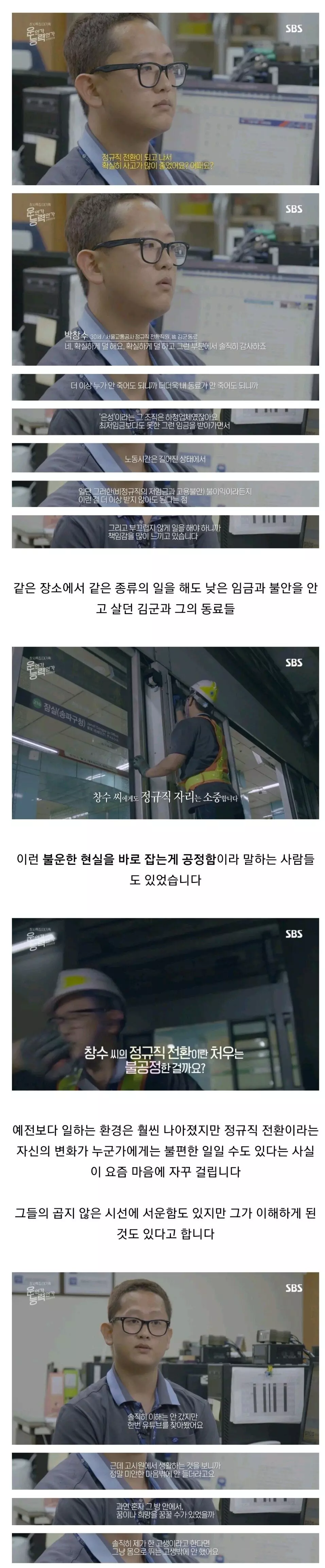 열심히 노력해서 공기업 정규직에 채용된 사람들의 업무, 인사, 급여 내용과 비정규직으로 일하다 정권바뀌고 정규직으로 전환된 사람들의 업무,인사,급여 내용이 많이 겹쳐진다면 그건 잘못된 거 맞지. 하지만 많이 겹쳐지지 않고 일정 수준 분리된다면 문제 될 거 없지 정규직 업무든 비정규직 업무든 회사에 필요한 업무이자 자원이니까. 이 부분을 프로그램에서 다뤘다면 더 좋았을 텐데 그런 내용은 없네.